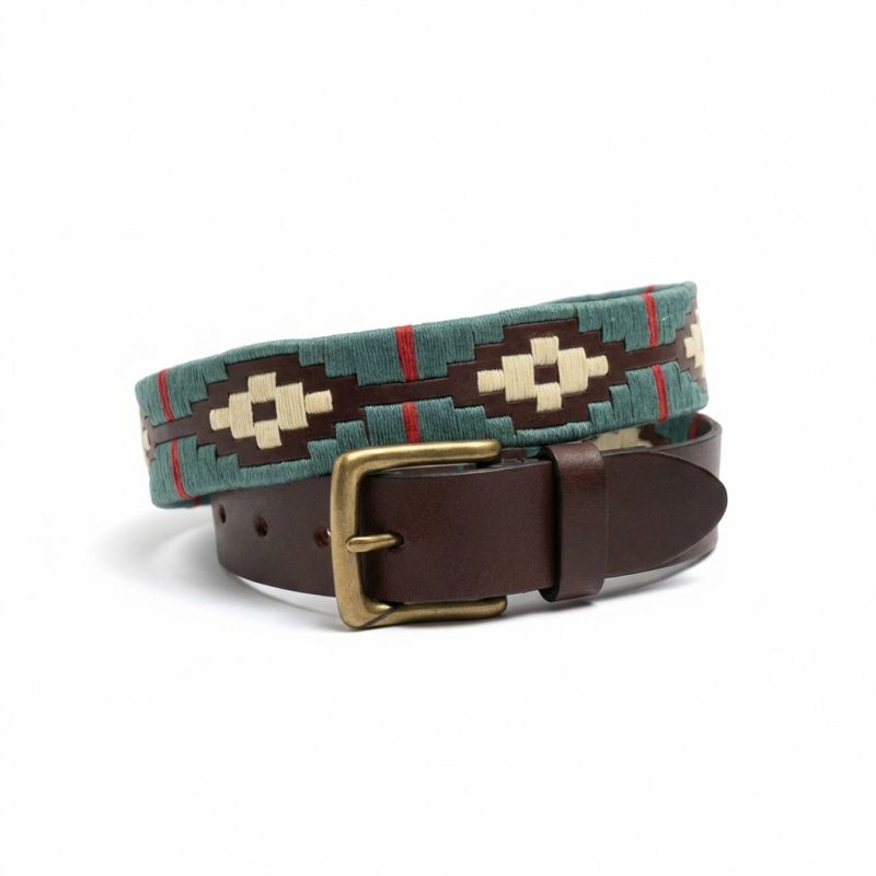 Este cinturón combina la calidad de la piel con un bordado geométrico icónico. Un accesorio diseñado para quienes buscan una pieza con carácter, historia y una durabilidad excepcional.