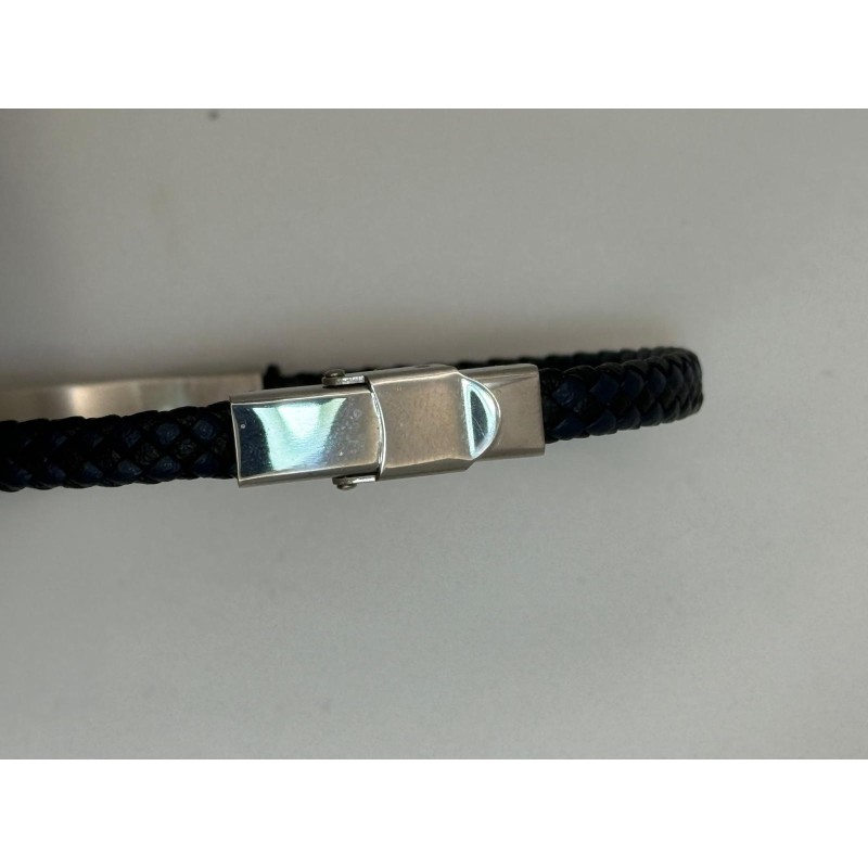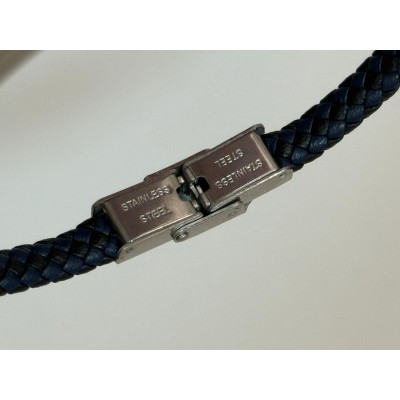 Pulsera trenzada de color azul y diseño en acero inoxidable con detalle de 3 círculos azules y cierre resistente.